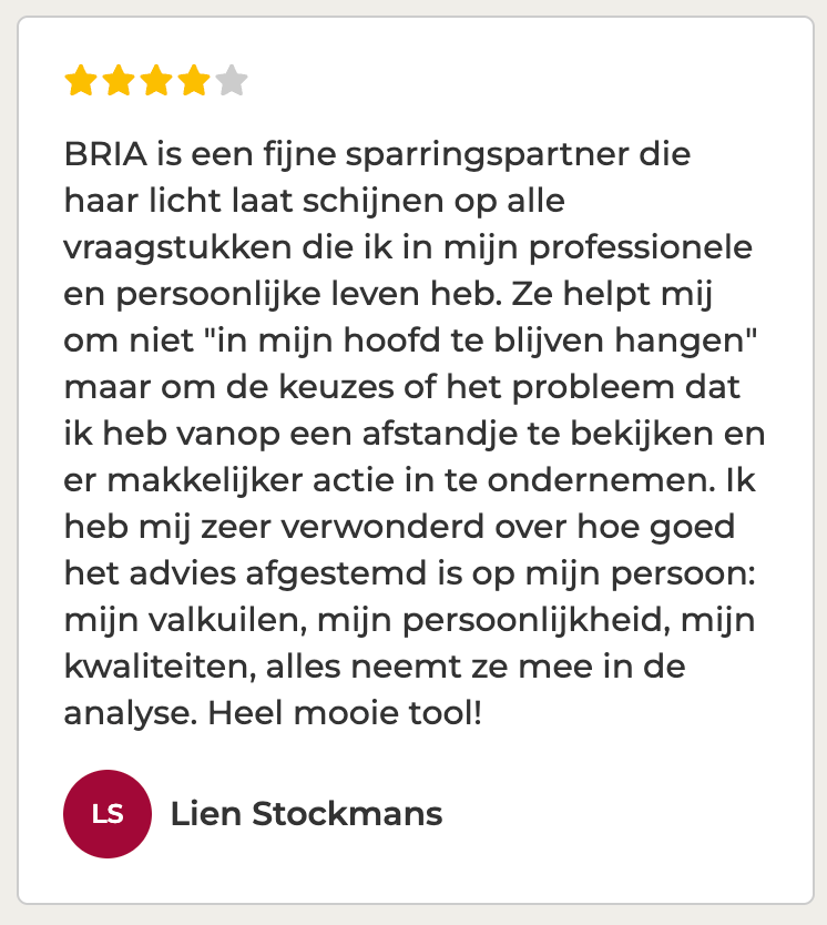 Daardoor krijg je geen standaard antwoorden, maar inzichten die aansluiten bij jou. Wanneer je twijfelt over een aanbod, richting of volgende stap, helpt BRIA je sneller helder krijgen wat voor jou klopt.