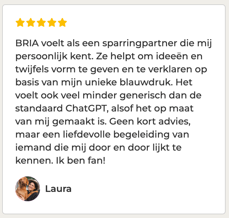 "BRIA GPT helpt mij om dicht bij mezelf te blijven en te voelen wat klopt, zonder te duwen of te sturen."